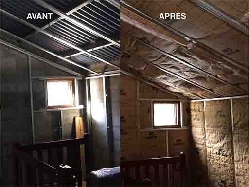 Isolation d’un plafond rampant en rouleaux de laine de verre écologique en 100mm d’épaisseur pour le plafond et en panneaux de 75mm pour les murs. Ce client a bénéficié de la prime partenaire AGIR PLUS d’EDF, le coût des travaux :1,34€/m² TTC fourniture et pose comprise. Contactez nous pour un devis gratuit, déplacement sur toute l’île de la Réunion.
