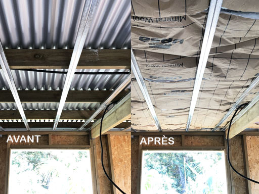 Voici un avant/après d’une pose de laine de verre 100% écologique en rouleaux 100mm dans la commune de la Ravine des Cabris (Saint Pierre)