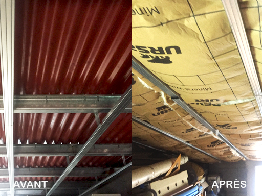 Isolation d’un plafond par l’intérieur en rouleaux de laine de verre écologique de 100mm d’épaisseur.