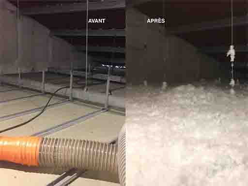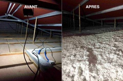 Isolation des combles perdus en soufflage de laine de verre écologique en 100mm d’épaisseur.