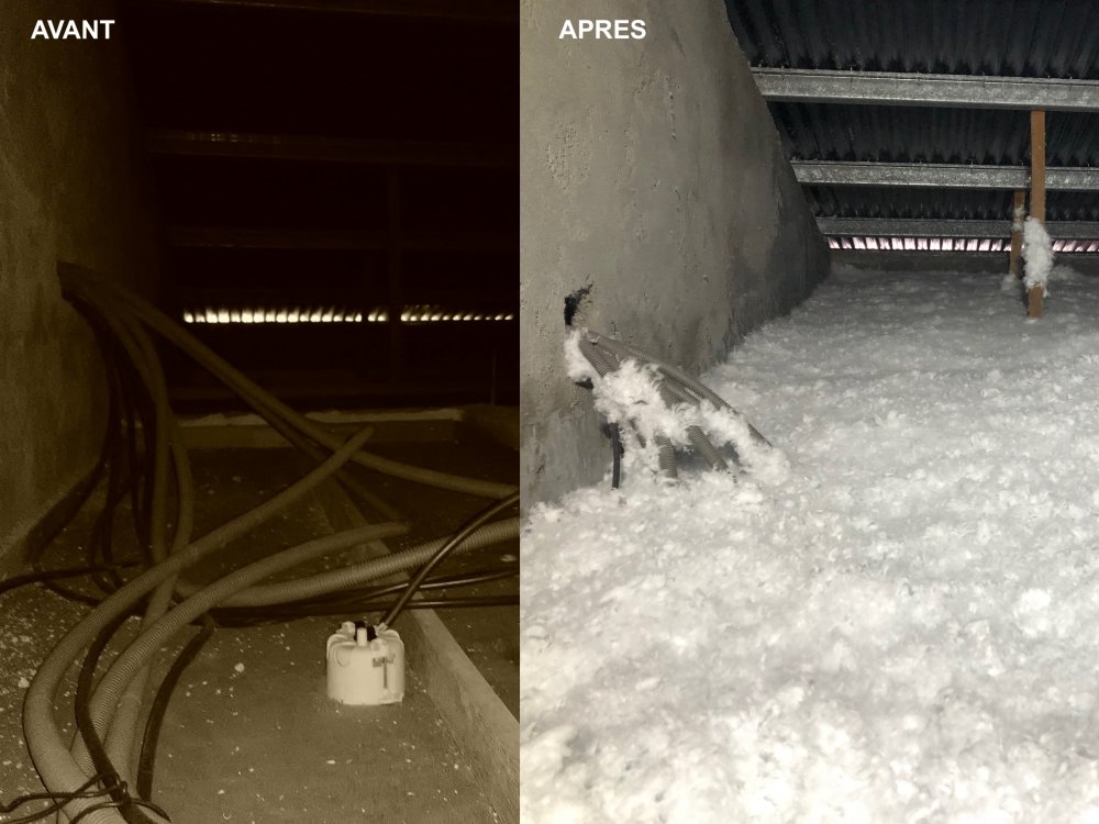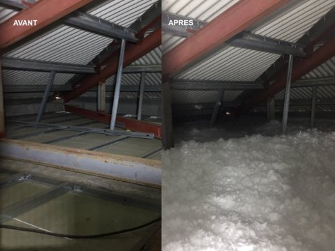 Isolation du plafond par l’intérieur en soufflage 100mm d’épaisseur.